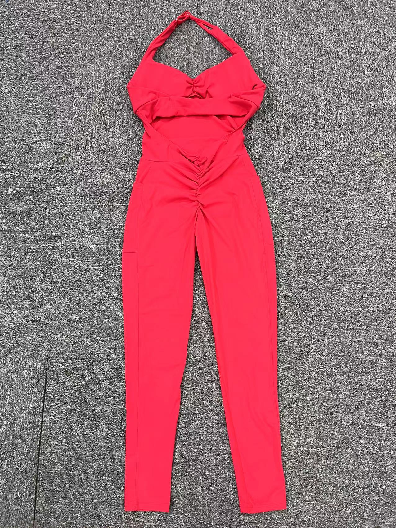 • Hanging Neck With Pockets On Both Sides Backless Fitness Tight Sports Jumpsuit  QS520166